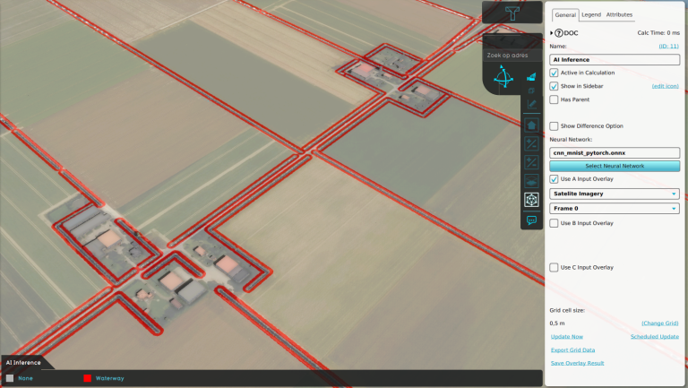 This is done by training a model in an industry standard program like PyTorch and export it using the Open Neural Network Exchange (ONNX) format to the Tygron Platform, where it is integrated into our existing GPU infrastructure. Subsequently, the user would get a new AI Inference Overlay capable of interfacing with all other Tygron datasets and conducting inference on them. This method is presently under development and is anticipated to be included in our upcoming Preview release later this year.