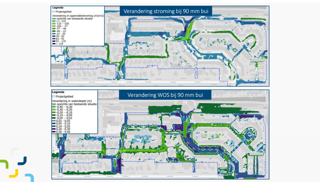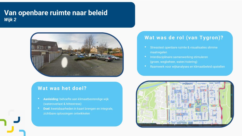 The first case study was a good example. In an existing residential area without planned sewer renovations, they still wanted to take climate-adaptive steps. By simulating a 90mm downpour, it immediately became clear where water accumulates and how it moves. Emiel Oosterhuis explained why Tygron was used in this case study. “It’s an excellent visualization tool. We’d like to sit down with policymakers and show them where the problems lie and how we can solve them.”